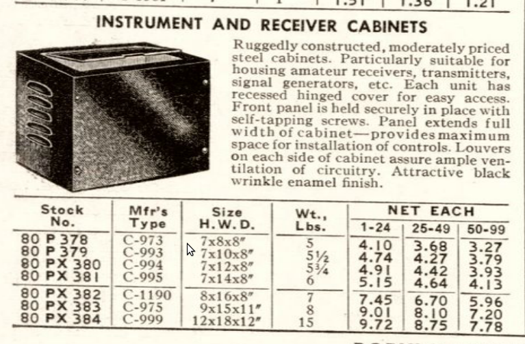 Choosing a type and size of cabinet for the clock was a tough decision. I wanted something that would show off some of the inner workings, but it had to have a military or commercial look and be authentic from that era, so anything home made with wood or plastic was out of the question. I had done some prototyping to get a pretty good idea of the amount of circuitry needed, and therefore an estimate of the volume required, so when I saw an unused but nicely aged Bud C-975 cabinet with a hinged top and wrinkle finish on Ebay, I jumped on it. As a side note, I found the C-975 in the 1959 Allied catalog for $9.01, or only $7.20 if you bought 50 of them. As you might guess, fitting 94 tubes and all the other parts into a 9x15x11" box got a bit tight in places, but that was one of the challenges that made the project fun.