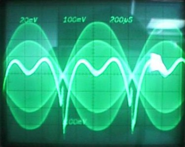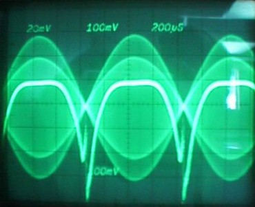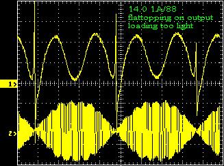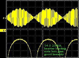 Note the large drop in anode voltage from the nominal no load value of 7000 V (in part due to the wimpy wire in my AC mains......I'm working to correct this). For details on the AC input characteristics (current, power factor, etc), see the AC data. With voice modulation, the cap bank is able to hold the voltage much higher and fairly constant. These are early results, and operating conditions will need to be optimized further. In particular, bias should probably be reduced and lighter loading used, since IMD performance looks like it's better than it needs to be. Hopefully the data presented here will be useful and encouaraging to those of you who are considering using this tube. I expect to have test data reflecting actual voice performance available soon. Reduced bias from 280 to 200mA. The result is more nonlinearity at the low power part of the waveform. Error trace now fills the screen, but IMD is still OK at -45dBc.
