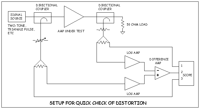 This system uses two CW signal generators, 2 separate amplifier chains, and a combiner to sum the RF tones together. When possible, I also use a pad at the output of the combiner to improve the amp input termination and increase isolation between the amplifier chains. The problem with continuous two-tone testing with either of these methods is that the peak to average ratio of the test signal (2:1) is much higher than that of typical voice (maybe 5 or 8 to 1). The result is a test that is easily interpreted in terms of quantifying the level of distortion generated, but is far too severe to be representative of normal voice operation. The load on the power supply drags the anode voltage down enough that the adjustments obtained won't be optimal for voice. I'm currently working on a generator that will produce a lower (adjustable) duty cycle signal but still allow me to measure IMD on a spectrum analyzer and get the familiar "dB below PEP" type results. A signal like a two-tone burst properly gated at the zero power crossing would probably be a good place to start. Another tool I use for distortion testing in the time domain is the system pictured below: